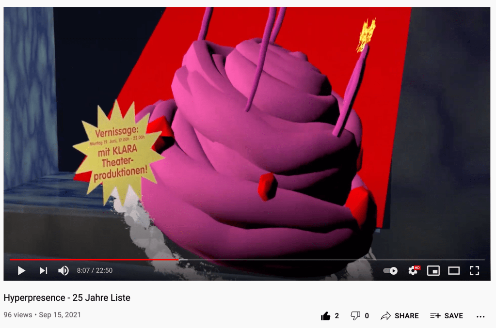 this video animation “virtual retrospection” is a virtual exhibition of the last 25 years of Liste seen from the perspective of a curator freed from mundane constraints such as space. The video consists of digitally reproduced artworks, photographic material and snapshots and shows various important events of the list during the last 25 years. The work retrospectively inspects the tightly woven web of an art fair like the Liste, including the artists, their artworks, galleries, visitors, the fair and its team, but also the place itself.