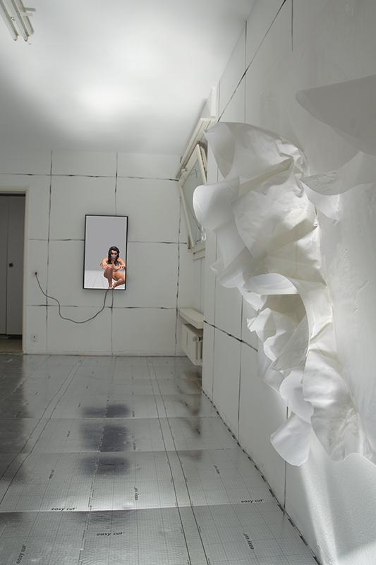 A white, three-dimensional “painting” could serve as a fragment of a more comprehensive, abstract, physical portrait of the virtual character monika in space. The assemblage of ruffles and flounces appears as an encoded translation of virtual reality and refers throughout the installation to questions of identity, gender and self-determination, while at the same time questioning the way we deal with avatars – who could soon become our idols.